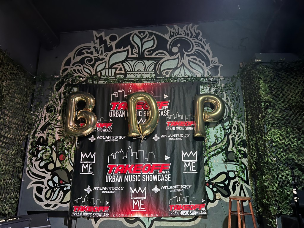 Patrons flooded EAV Treehouse, many know to be the home of the Takeoff ATL music event and showcase, with blue and black balloons as attendees talked amongst themselves.