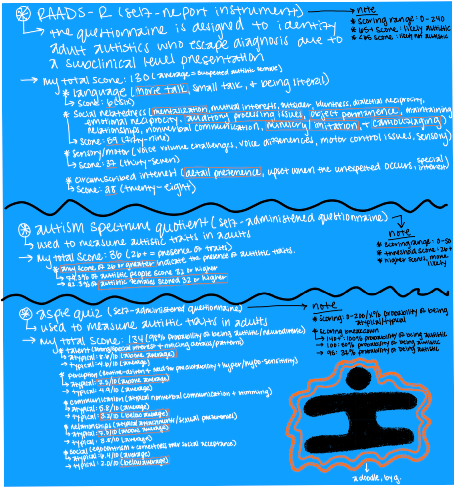 just wanted to note that i also did an adhd questionnaire, and my score was 1435. apparently, based on the scoring, anything above 1399 means i have “some specific symptoms related to adhd.”