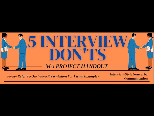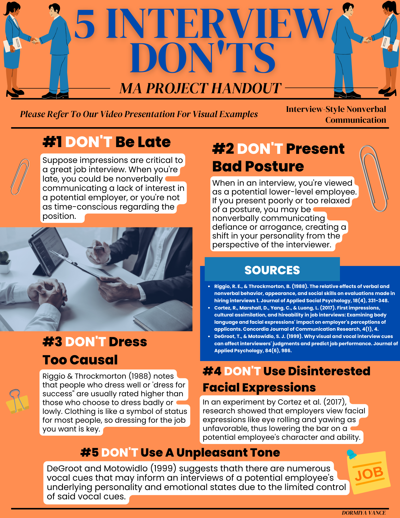 Nonverbal Communications Final Summer ’23: I chose a more creative final option during my only summer course. I chose to record a “five don’ts for [job] interviews” social media style video. The video is recorded for platforms like TikTok. I scored an A on this assignment.