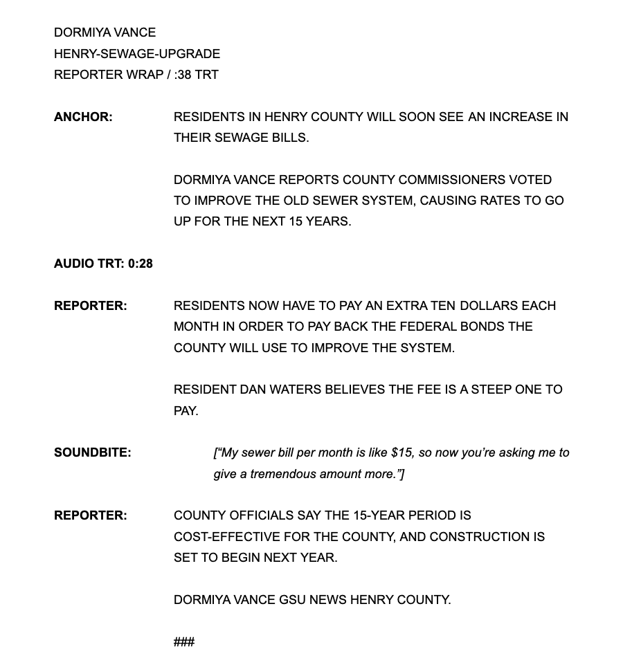 Here are a few samples of the more “daily” commercial style radio news stores that I’ve compiled for this section. These files showcase the broadcaster side of me and some audio mixing to top it off. I have also included one of my final projects from Fall ’23 that includes a mock newscast for a commercial station. The assignment was a challenge and I believe my skills were tested but captured well at the end.