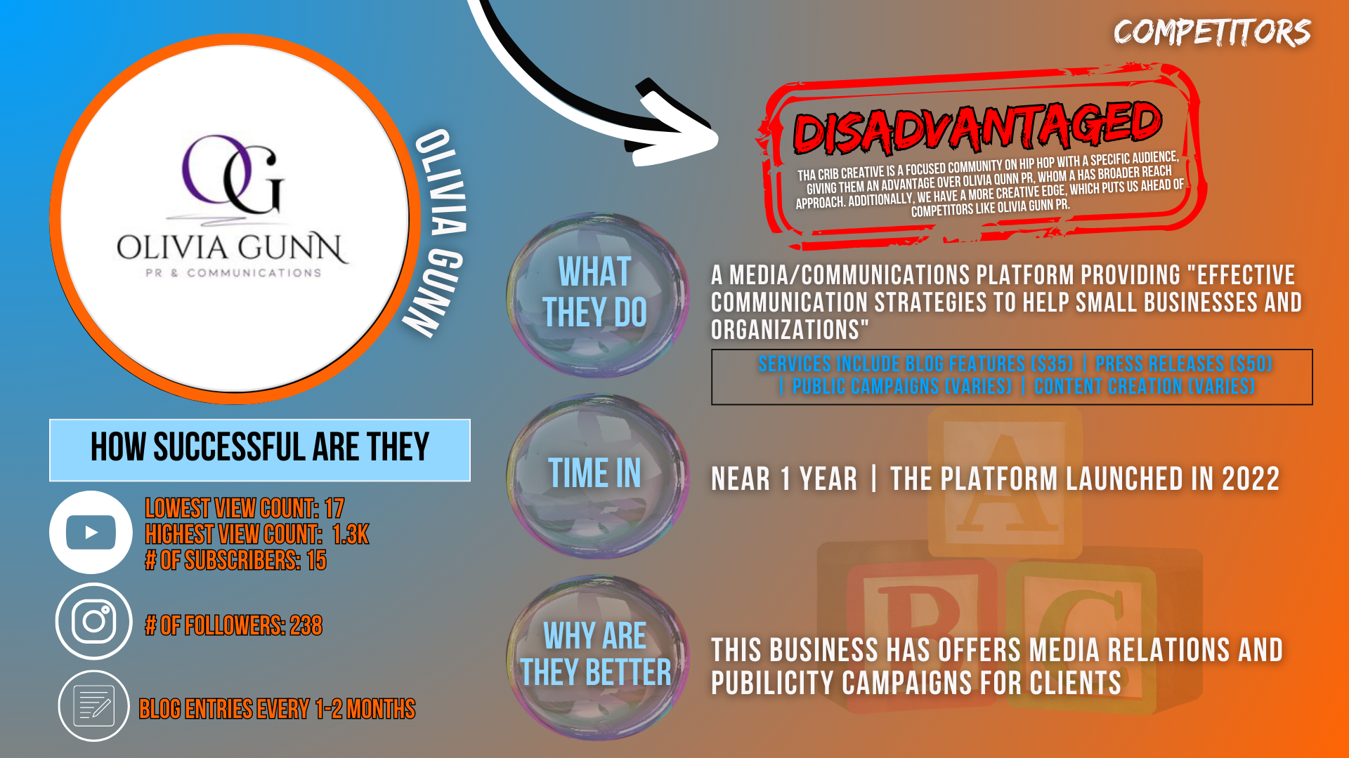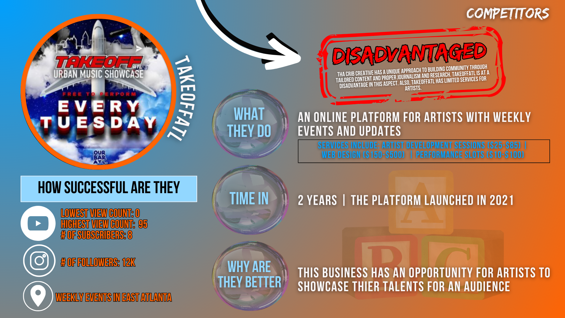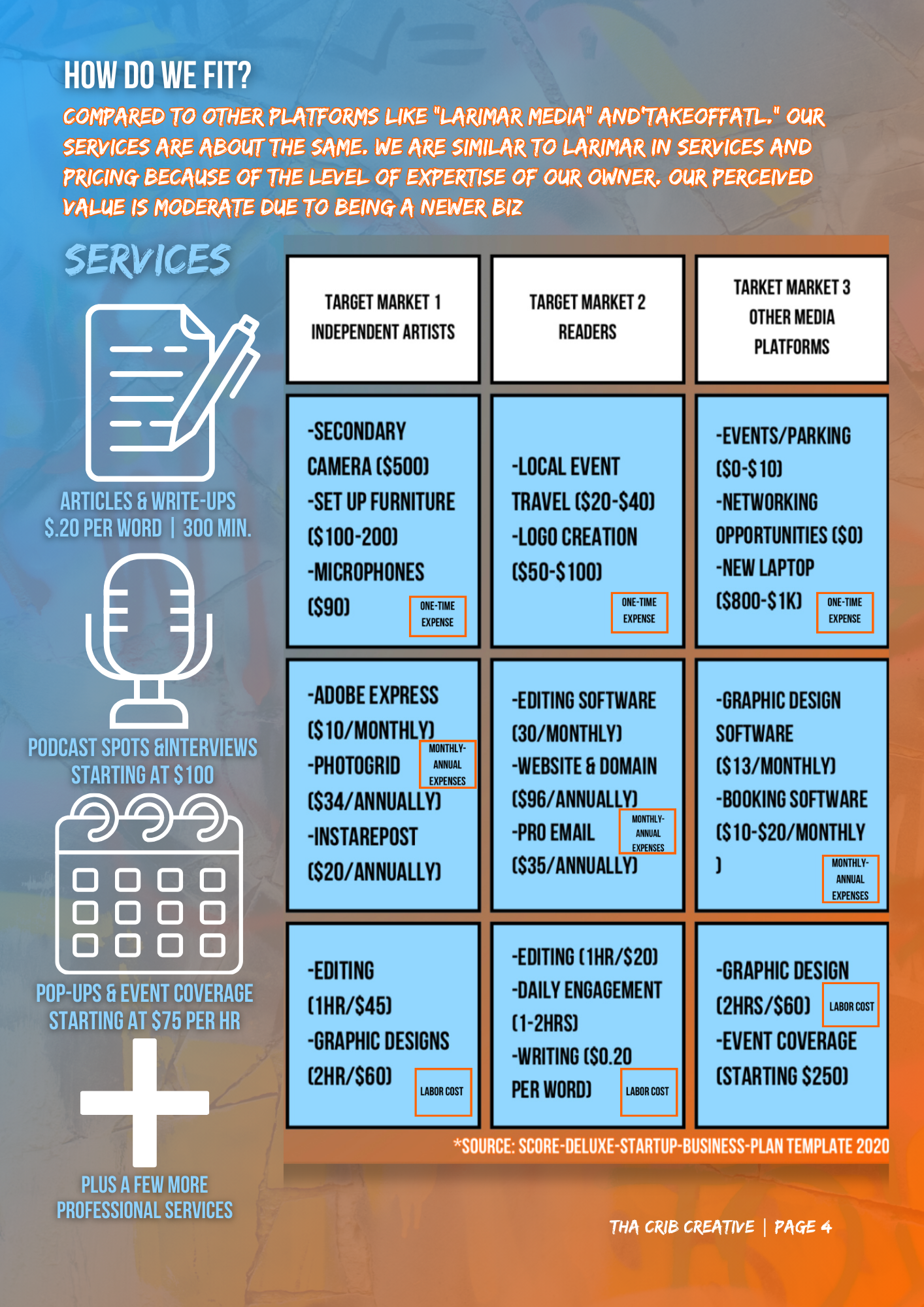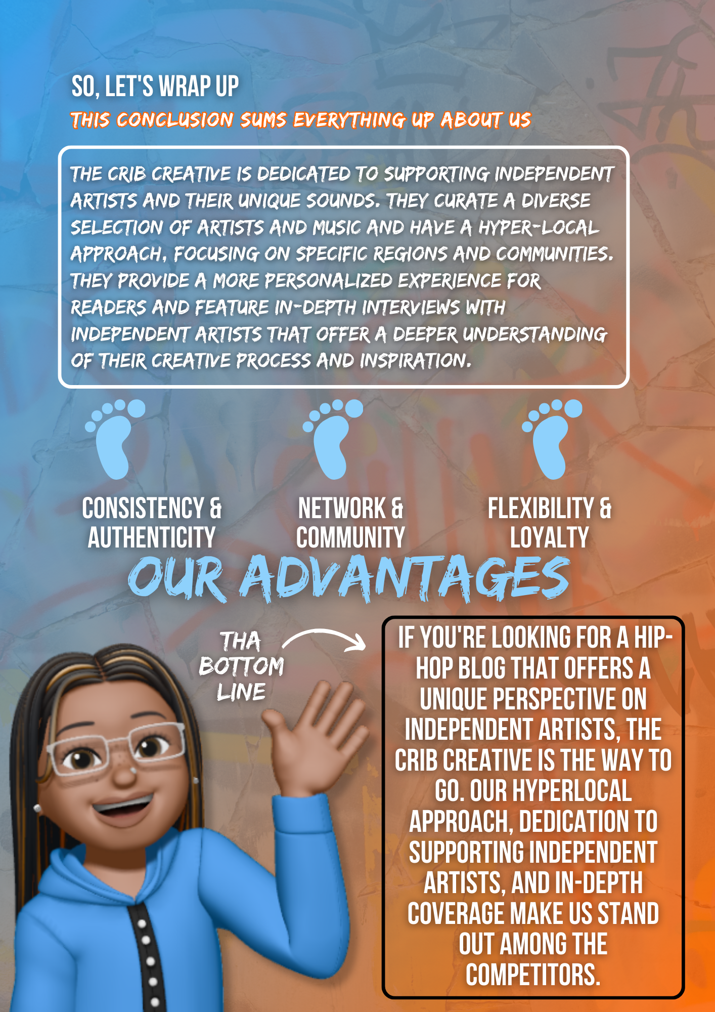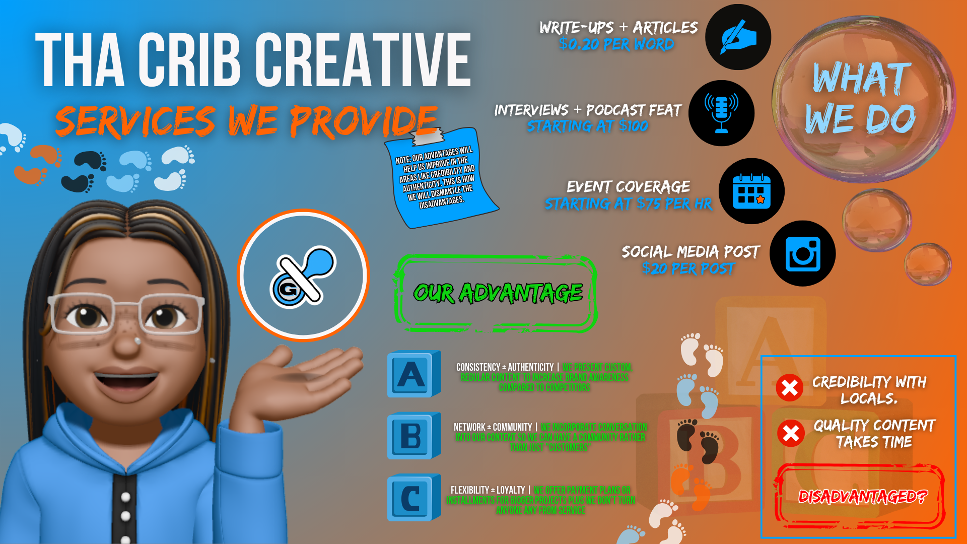 This section includes my business plan for my own social media platform, Tha Crib Creative, highlighting independent Hip Hop artists in Atlanta and on the East Coast. I have also included a more detailed version of my business plan below via the gallery. I complied research along with various create elements for the final result of this plan. I completed this project in the Spring ’23 semester.